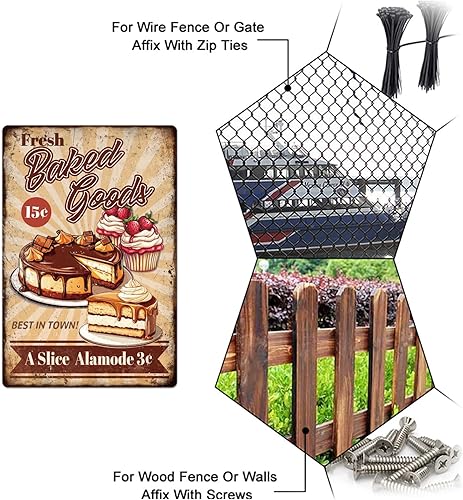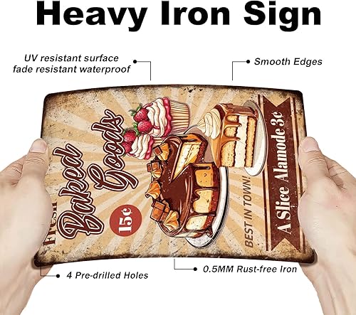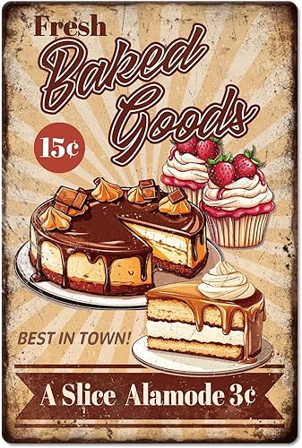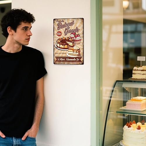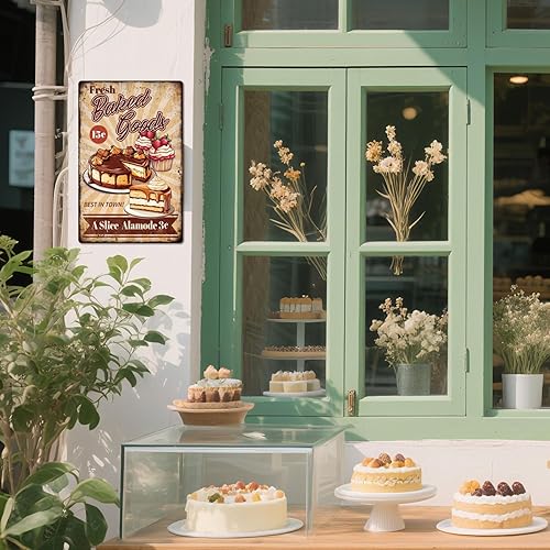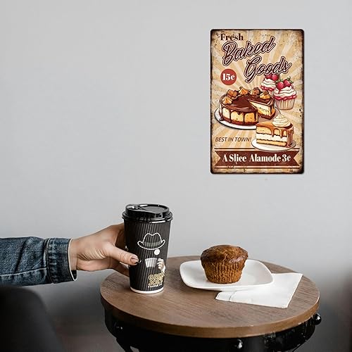 GLOBLELAND Panneau en Métal de Cuisson de Gâteau Frais 'Fresh Baked Goods' Peinture Vintage Affiche en Étain 12x8 pouce Rétro Plaque D'Art Mural pour la Maison du Bureau des Restaurants la Pâtisserie