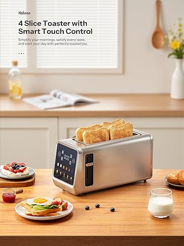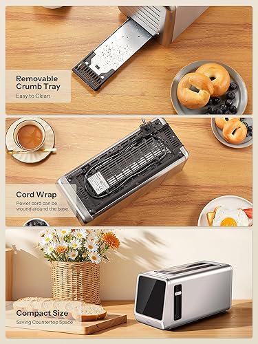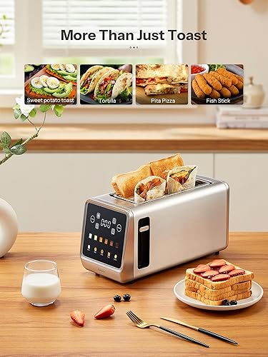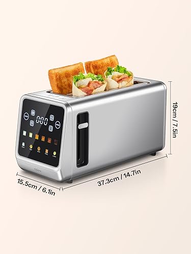 Grille-pain à fente longue en acier inoxydable avec écran tactile intelligent et fonction mémoire, Grille-pain 2 tranches avec 6 niveaux de brunissage, 5 types de pain, fonction décongélation & réchau