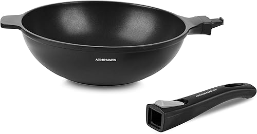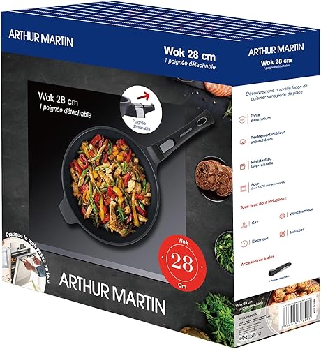 Arthur Martin - Wok 28 cm - Fonte aluminium revêtement anti adhérent anses et poignées détachable - Tous feux dont induction - Passe au lave-vaisselle - Poignée amovible, Noir