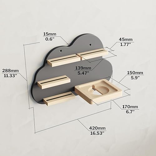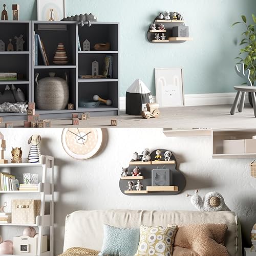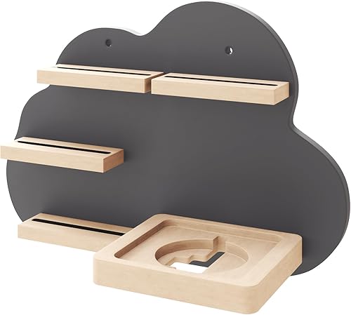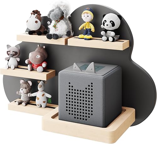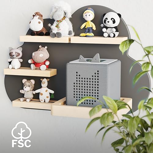 KD Essentials Étagère Tonie pour haut-parleurs et figurines (étagère murale en bois FSC, peut contenir une Toniebox et de nombreuses figurines Tonie avec supports magnétiques, beau design nuage, gris)