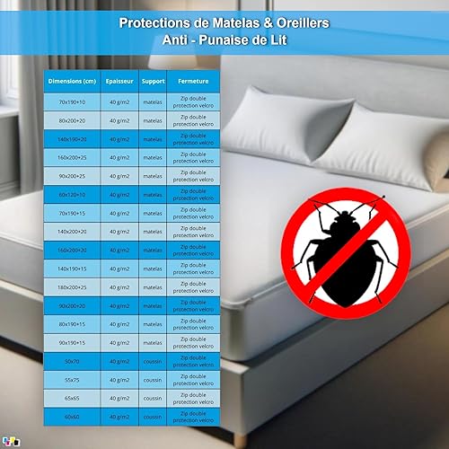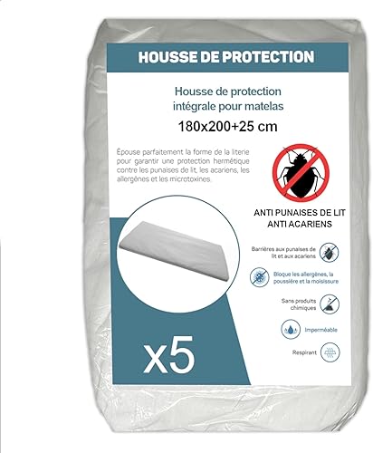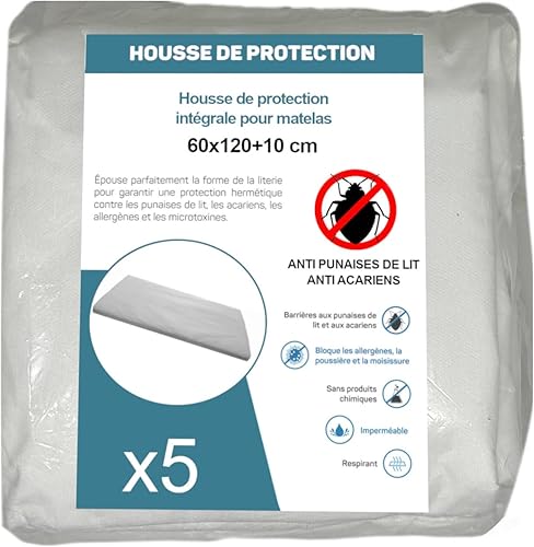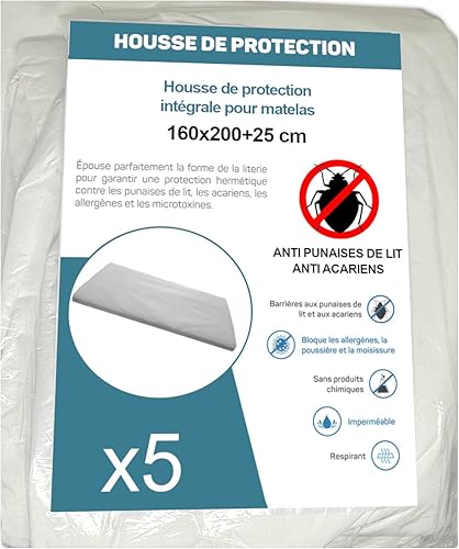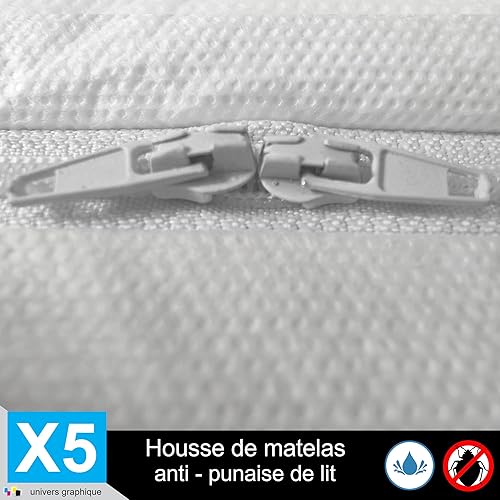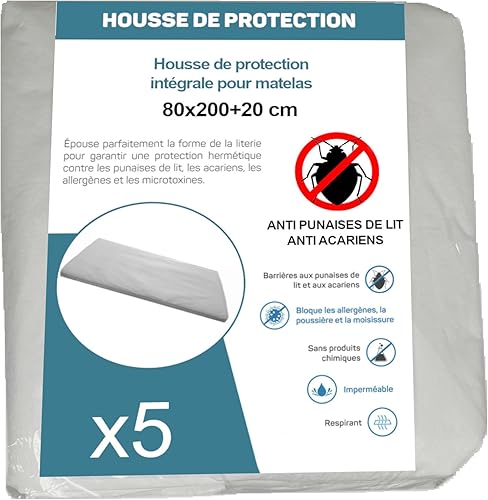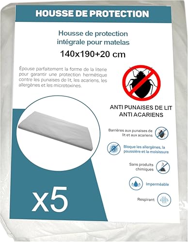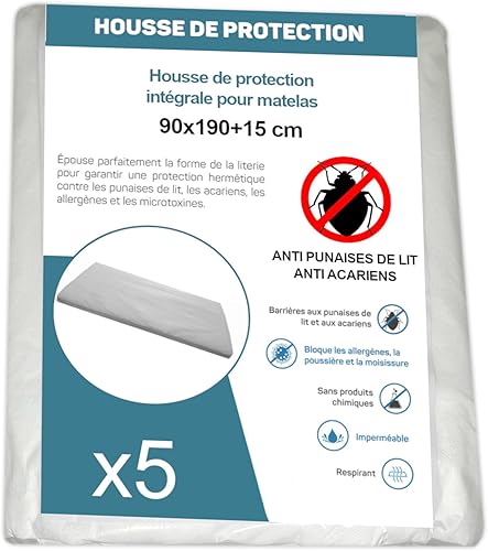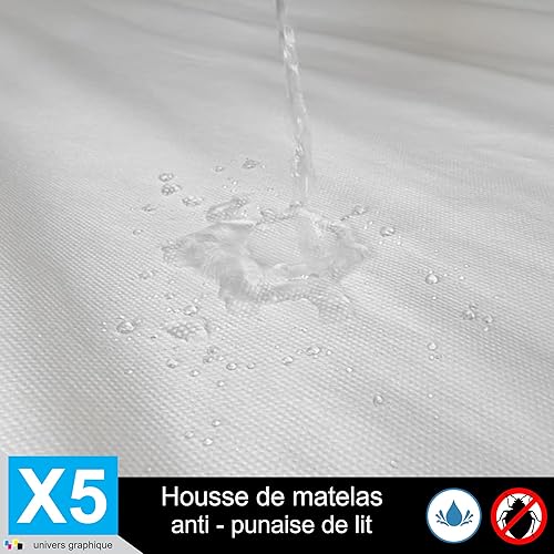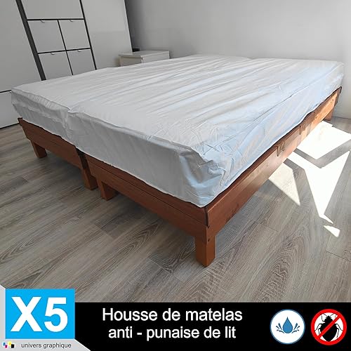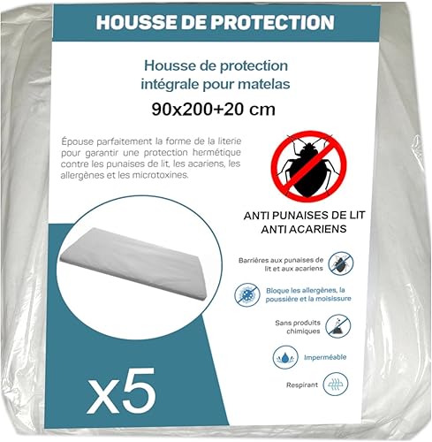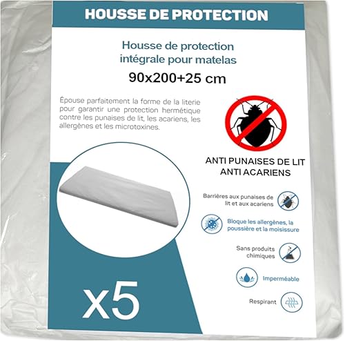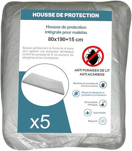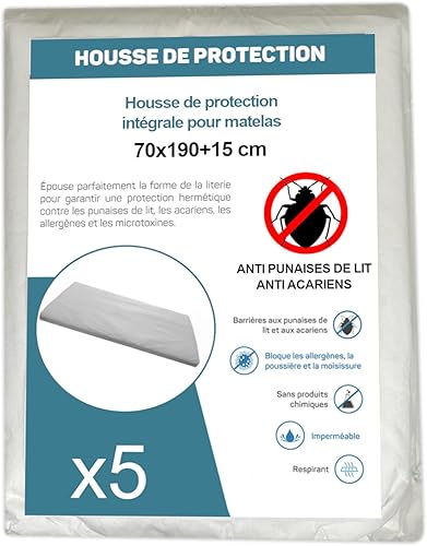 Housse de Protection Intégrale Anti-Punaise de Lit et Anti-Acariens pour Matelas 70 x 190 + 15 cm. (Lot de 5 Housses)