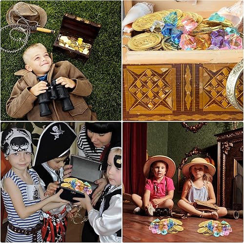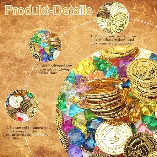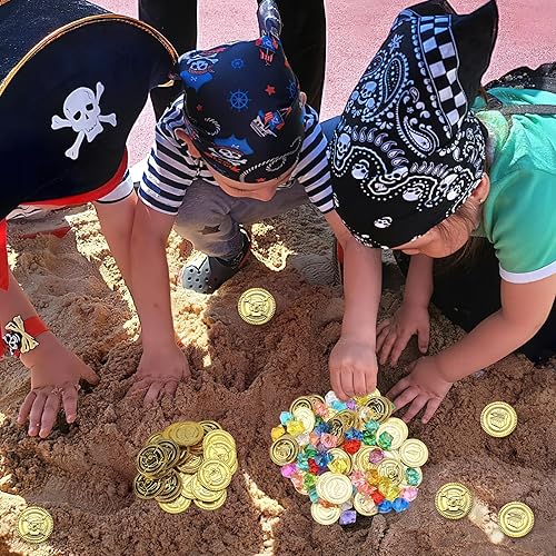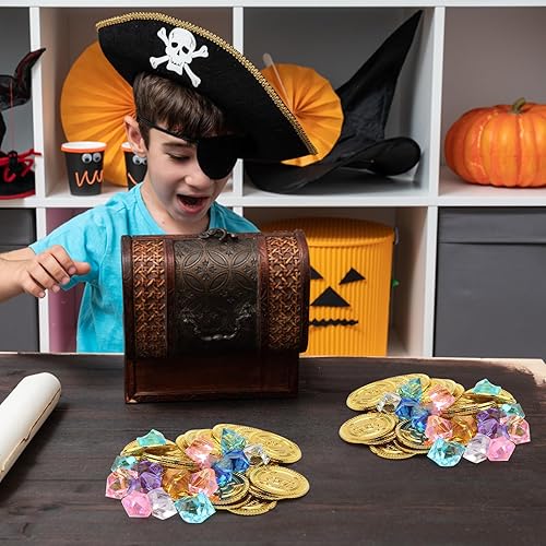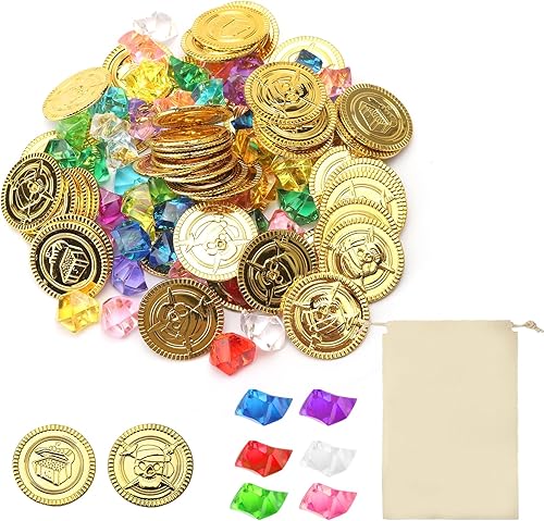 UOCAI Lot de 100 pièces d'or au trésor de pirate pour anniversaire d'enfant, boîte au trésor, décoration de pirate, petit cadeau de pirate, pierres précieuses pour enfants avec 50 pièces d'or et 50