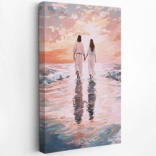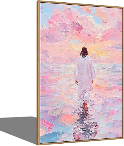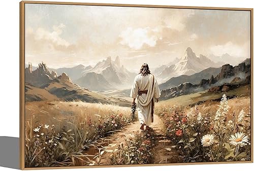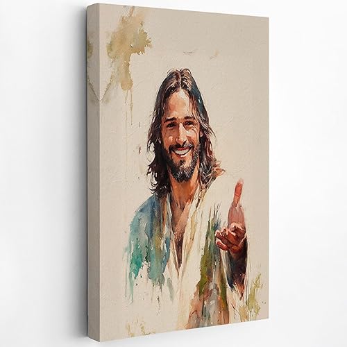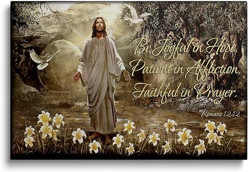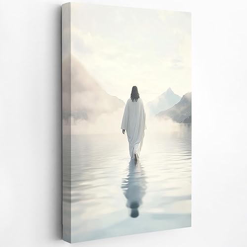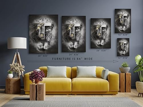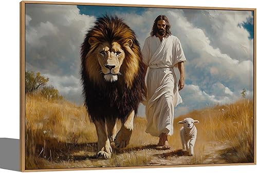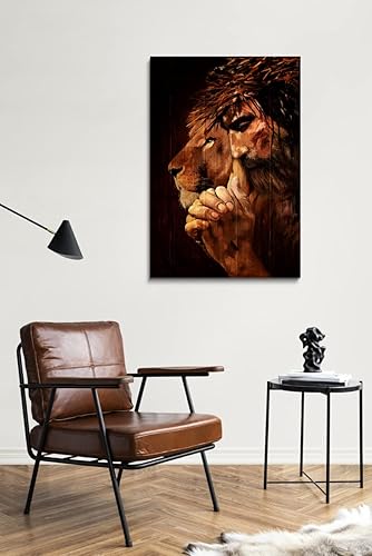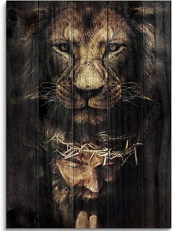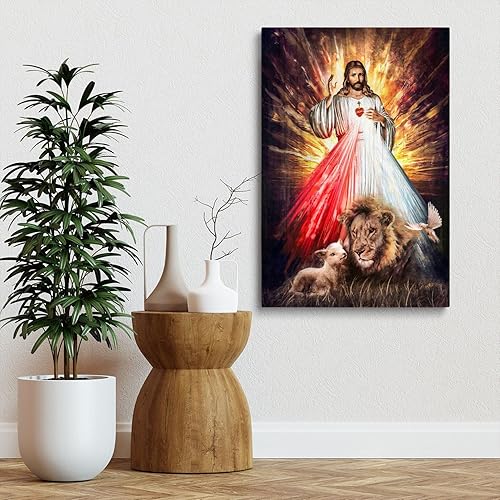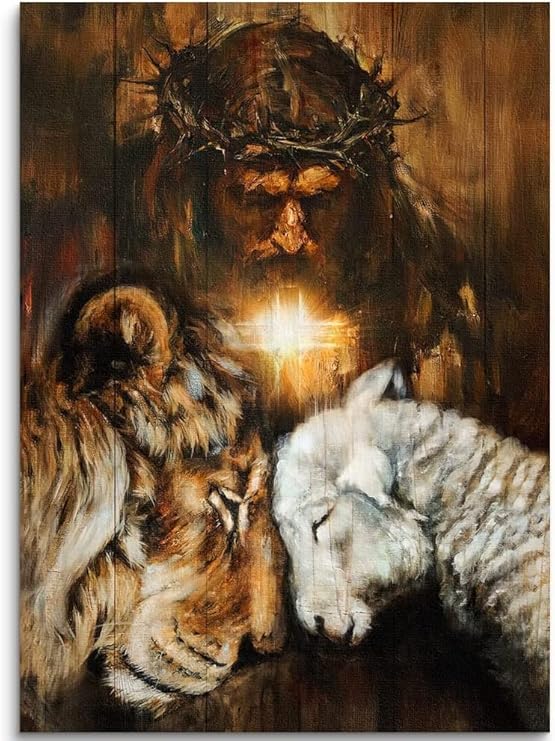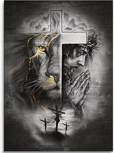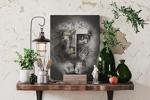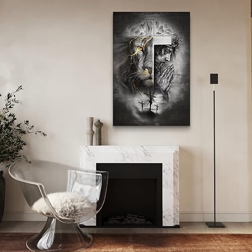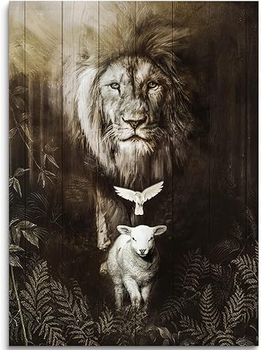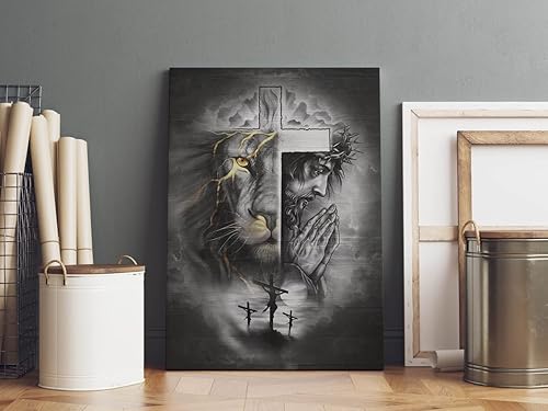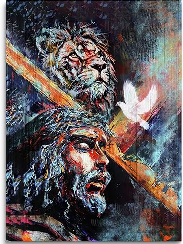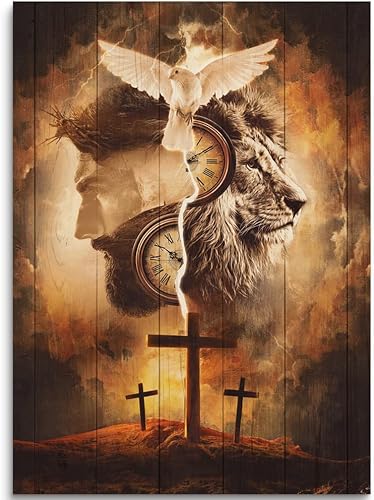 Toile Murale Chrétienne - Jésus, Lion, Croix et Colombe de la Paix - Art Poster pour Chambre - Prêt à Accrocher - 30 x 40 cm