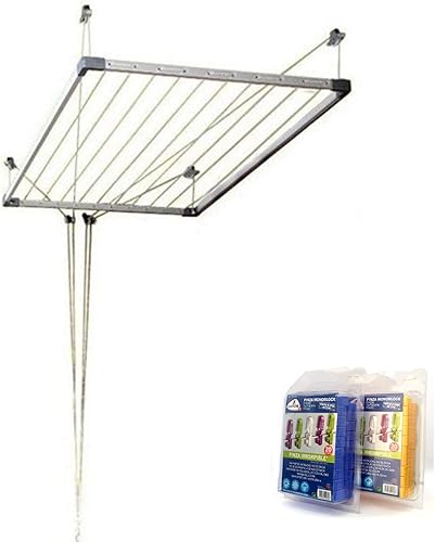 Bricolemar - Séchoir de plafond Cuncial Tezno-Techo avec manivelle pour monter et descendre + 40 pinces incassables, pack monobloc