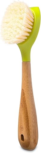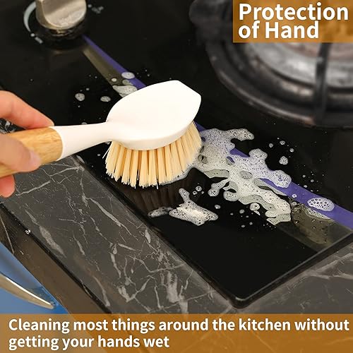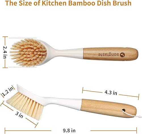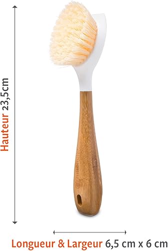 Lot de 2 brosses à Vaisselle de Cuisine avec Manche en Bambou - Grattoir intégré - Brosse à récurer pour poêles, casseroles, éviers de Cuisine, Vaisselle et Nettoyage Parfaits - Blanc
