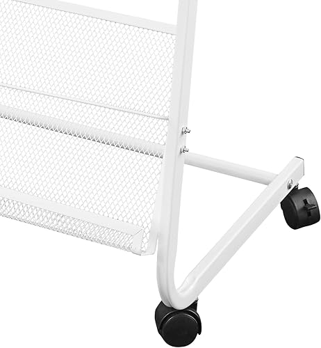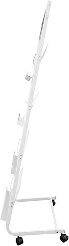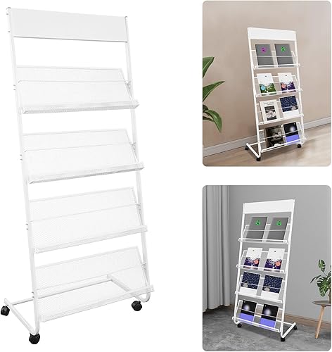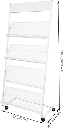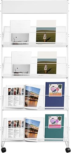 SuhoFutus Porte-revues à 4 niveaux, support de littérature au sol avec 4 roues, présentoir pour bureau, bibliothèque et zone de réception, en acier, porte-brochures A4, porte-journaux (blanc)