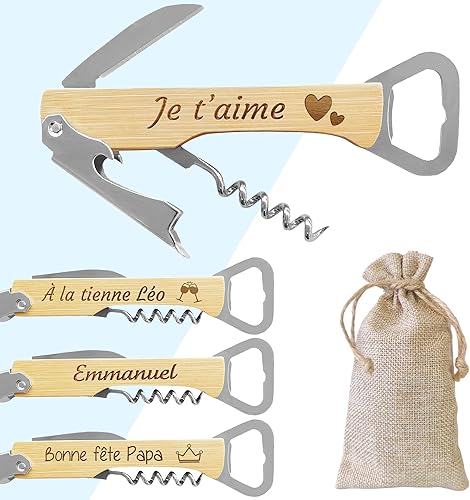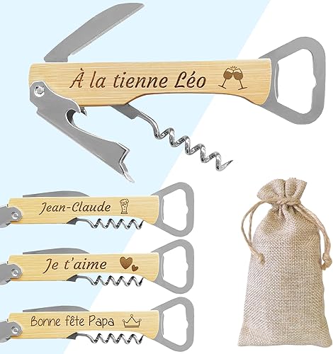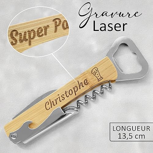 Tire-bouchon personnalisé - Limonadier personnalisable - Décapsuleur - Prénom gravé - Tire-bouchon sommelier bois et acier inoxydable - Idée cadeau homme, papa, fête des pères (Modèle Prénom)