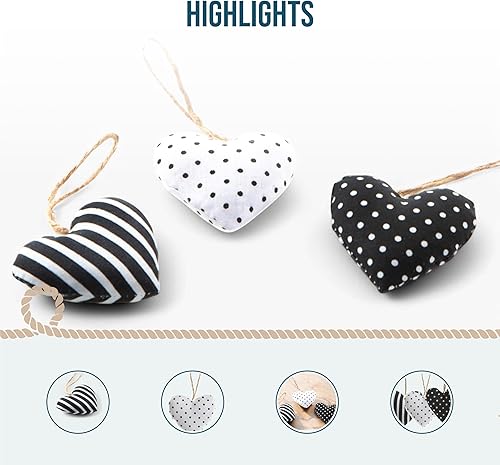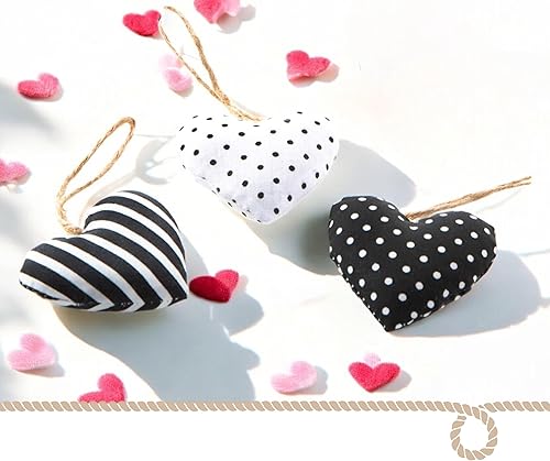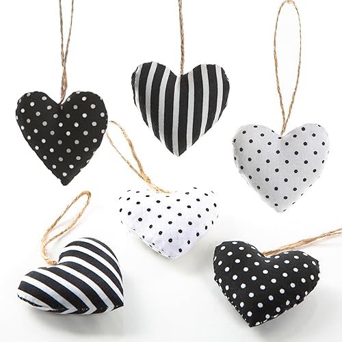 Cœurs à Suspendre en Tissu, Lot de 6: Suspension décorative cœur pour Mariage, été, baptême, décoration à Suspendre pour Branches, Noir & Blanc, avec Ficelle, 5 x 6 cm