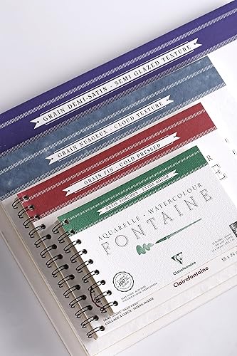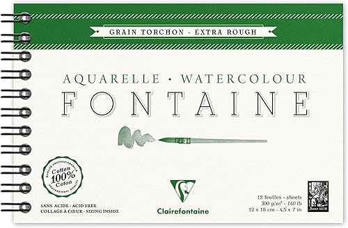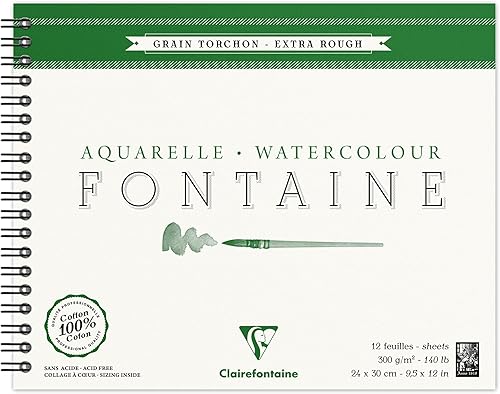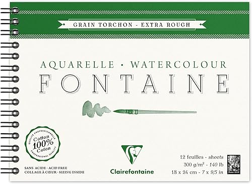 Clairefontaine 96321C Album Spiralé Fontaine - 12 Feuilles Papier Aquarelle Blanc 100% Coton Grain Torchon Qualité Professionnelle 24x30 cm 300g