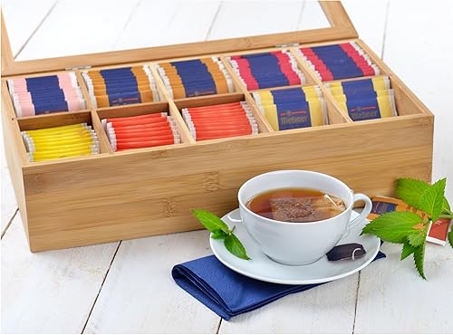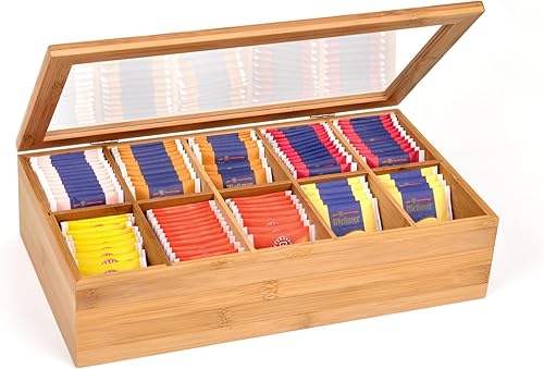 GRÄWE Boîte à thé en bambou avec 10 compartiments, couvercle rabattable, fenêtre transparente, boîte à sachets de thé pour conserver les arômes - 36 x 20 x 9 cm