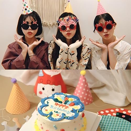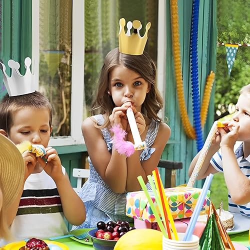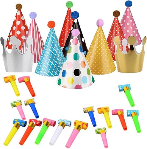 SGERUFZ 26 pcs Birthday Hat Kit 9 pcs Party Cone Hats 2 pcs Paper Birthday Crowns 15 pcs Colorful Whistles for Boy Girl Birthday Party