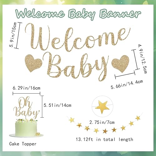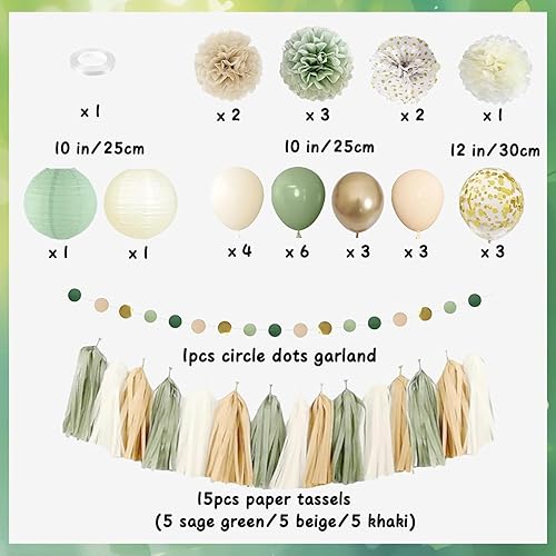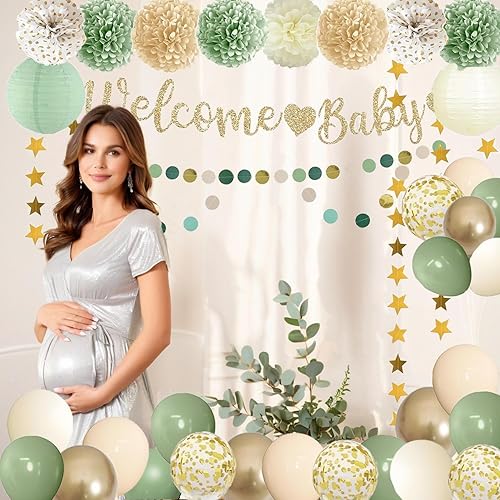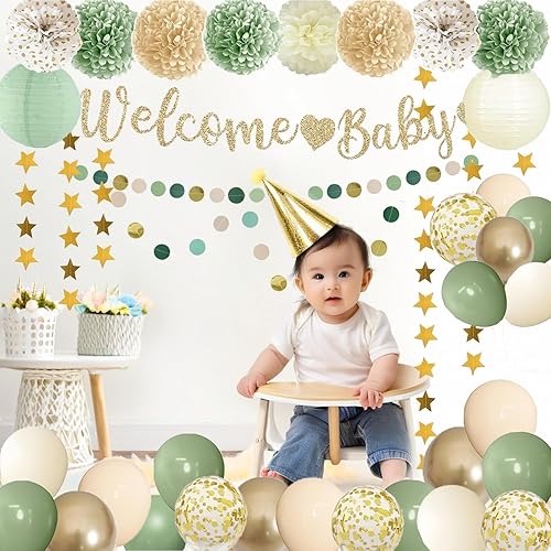 Acidea Décorations de fête prénatale, bannière de bienvenue vert sauge, ballons, décoration de gâteau, lanternes en papier, pompons fleurs, pompons, guirlande d'étoiles, fournitures de décoration de