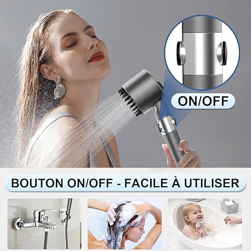 Pommeau de Douche Haute Pression, Pommeau Douche Anti Calcaire avec Tuyau 1.5M et Support de Douche, 4 Types de Jets Pommeau de Douche Economie Deau avec Bouton D'arrêt D'eau(Gris)