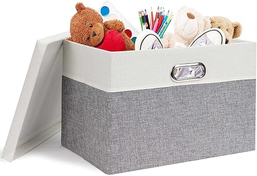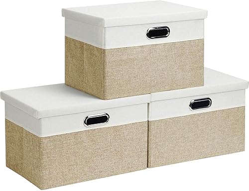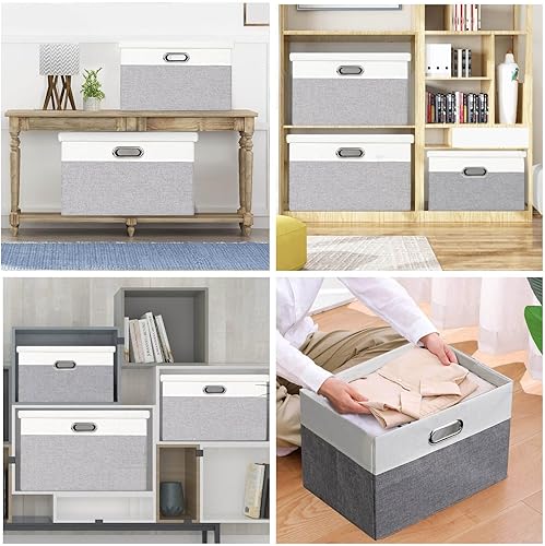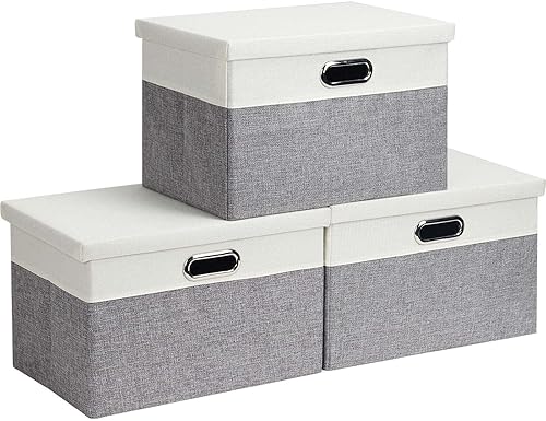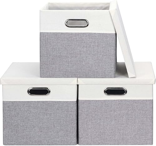 Febzoce Lot de 3 boîtes de rangement avec couvercles - Cubes de rangement pour étagères - Pliable - En tissu - Gris clair et blanc - 30 x 30 x 30 cm