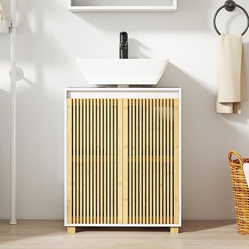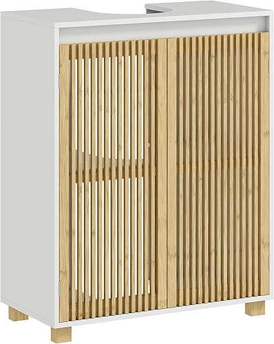 HOMCOM Meuble sous lavabo Salle de Bain Meuble sous Vasque Armoire de Rangement pour lavabo - Placard à Portes à Lattes en Bambou, 60 x 30 x 75 cm, Effet Bois Naturel
