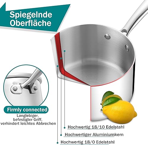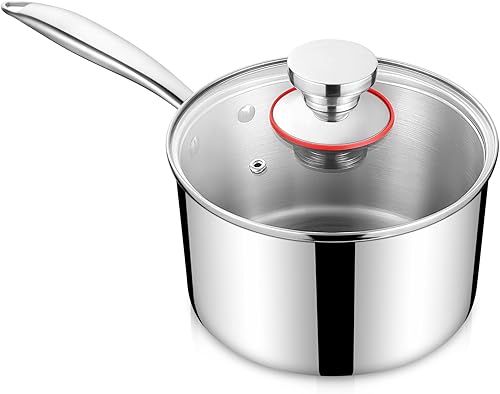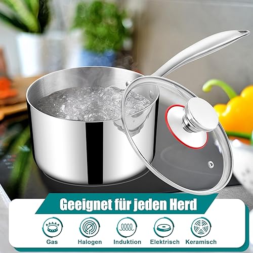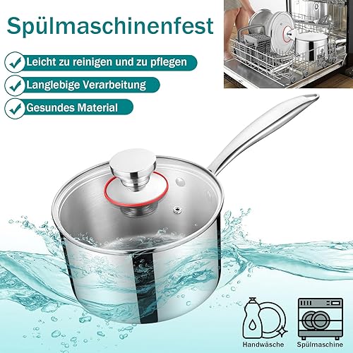 Homikit Casserole, 3 couches en acier inoxydable 14 cm avec couvercle en verre, petite casserole à lait, induction 1,4 L, casserole à lait pour tous les feux