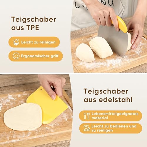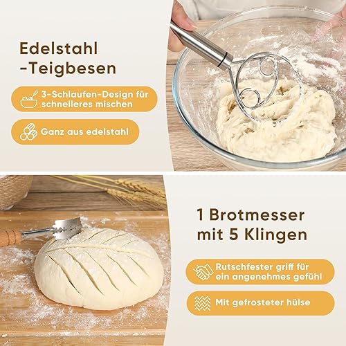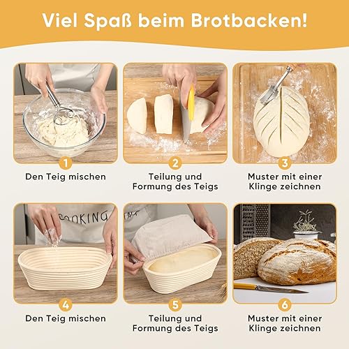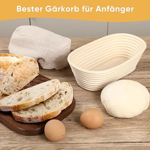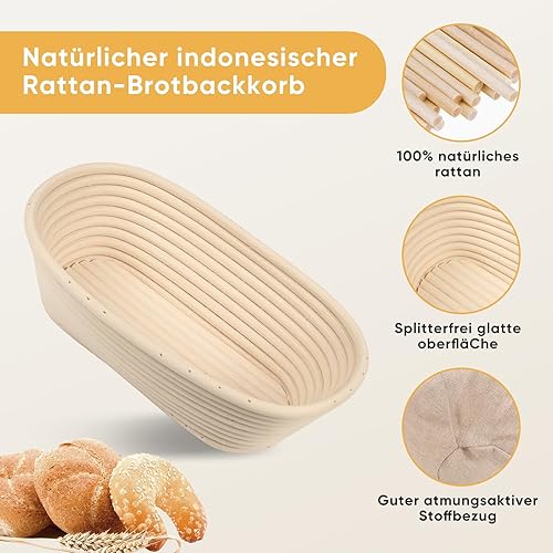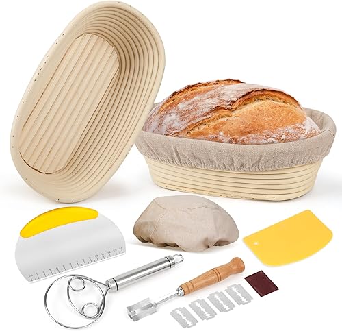 Lot de 2 Banneton pour Pain Ovale de 25cm,Corbeille à Pain+Grattoir en Métal + Grattoir en Plastique + Fouet à Pâte + Lame à Pain, Idéal pour la Pâte à Pain au Levain et à la Levure