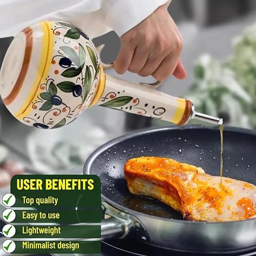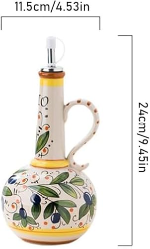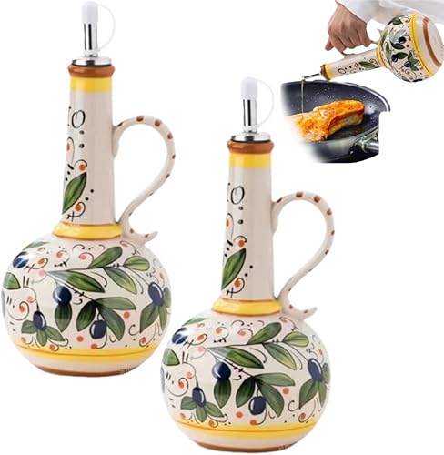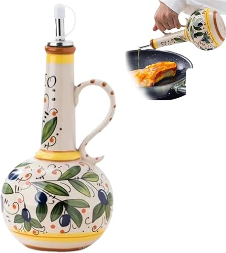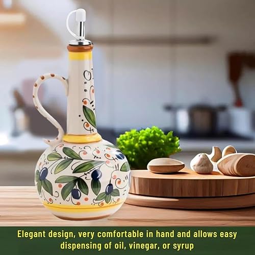 Flacon distributeur d'huile d'olive italien en céramique 652 g, peint à la main, en grès décoratif pour la cuisine avec bec verseur en acier inoxydable pour huiles, sauces, vinaigre (1 pièce)