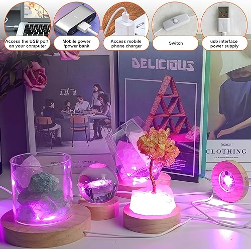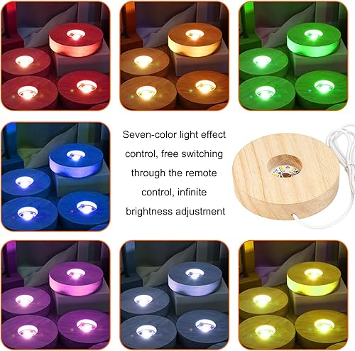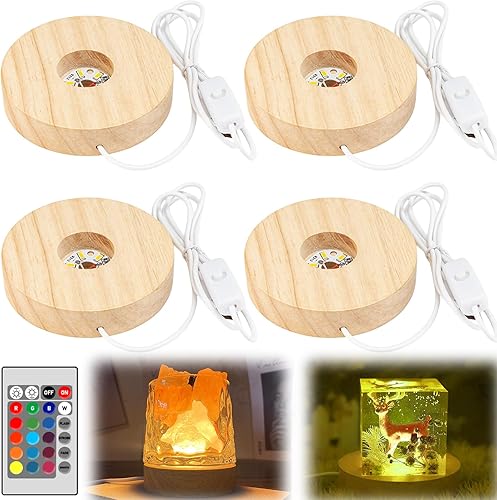 Lot de 4 socles LED en bois - 7 couleurs - Éclairage LED réglable - Dessous de verre - USB - Rond - Pour affichage en cristal, verre, acrylique - Bijoux en résine