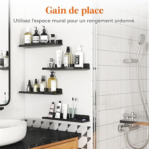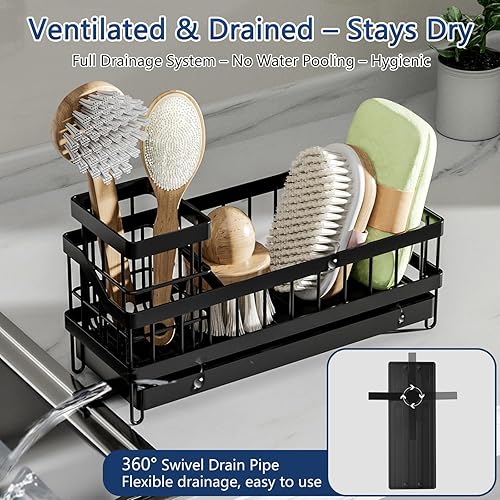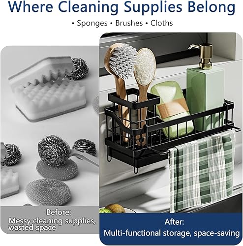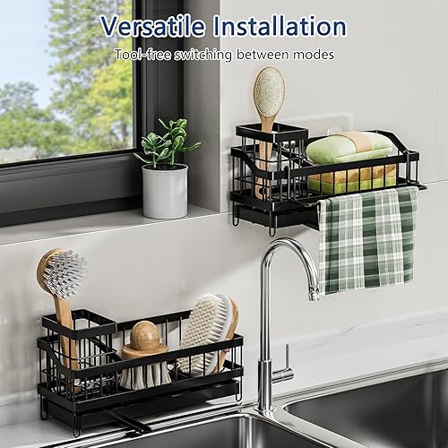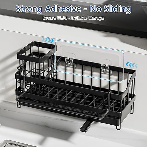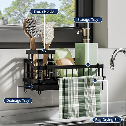 FOXWHALE Organisateur d'évier étroit, noir, organiseur de cuisine avec égouttoir et porte-chiffon, étagère murale sans perçage pour brosses/serviettes
