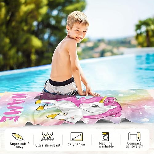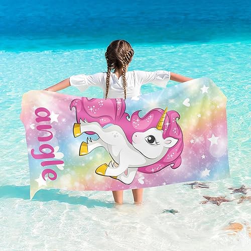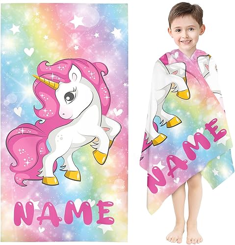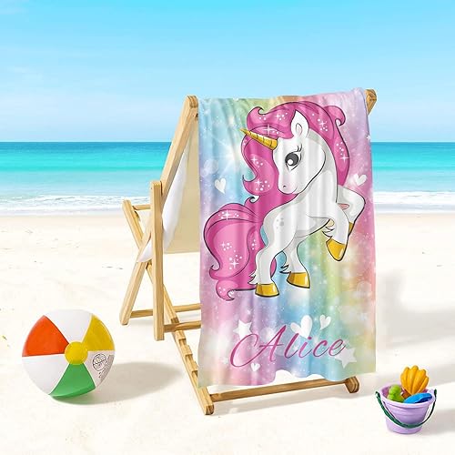 Fadaing Serviette de plage personnalisée avec nom, serviette de bain licorne arc-en-ciel, serviette de bain avec nom pour fille, licorne en microfibre, grande serviette de plage 100 x 200 cm,