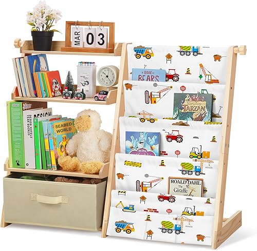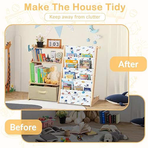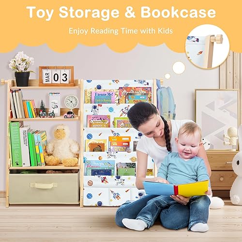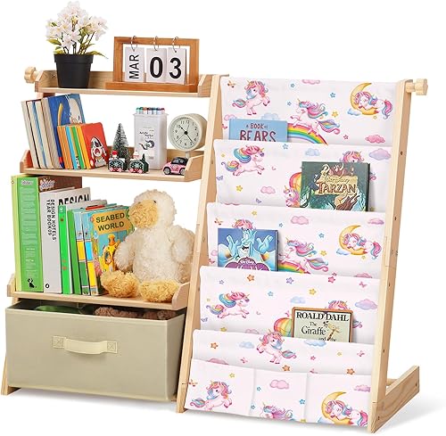 Bibliotheque Enfant avec 4 Étagères et 3 Compartiments Ouverts, Étagere Livre Enfant avec Boîte & 3 Poches, Coffre a Jouet pour Chambre d'enfant, Meuble Rangement Jouet avec Motif Mignon (Arc-en-ciel)