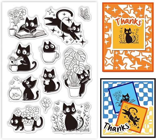 GLOBLELAND Jolis Tampons Transparents en Silicone pour Chat Noir Feuille Fleur Poisson Papillon Animaux de Dessin Animé pour Bricolage Scrapbooking Fabrication de Cartes Album Photo Journal