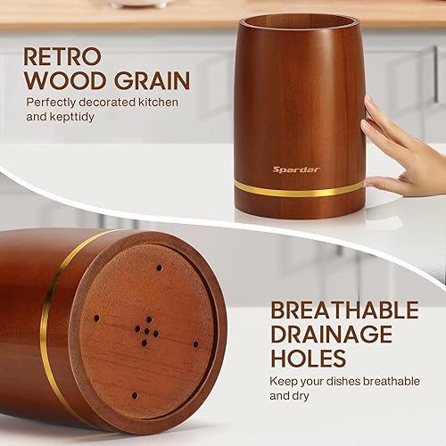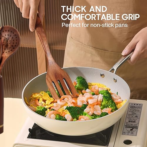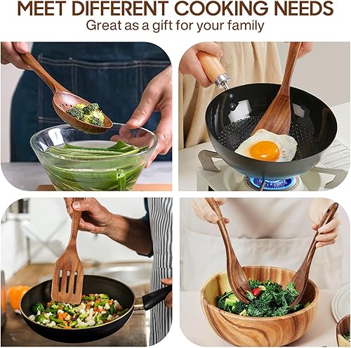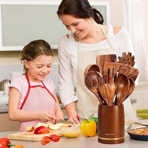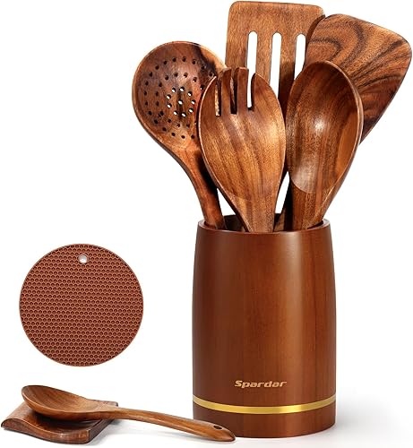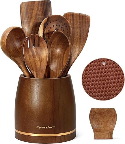 Spardar Ustensiles de cuisine en bois 12 pièces avec 9 cuillères en bois de teck, repose-cuillère, maniques, porte-ustensiles de 8,9 cm, comme décoration de cuisine et cadeau de pendaison de
