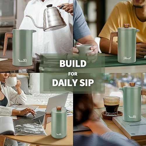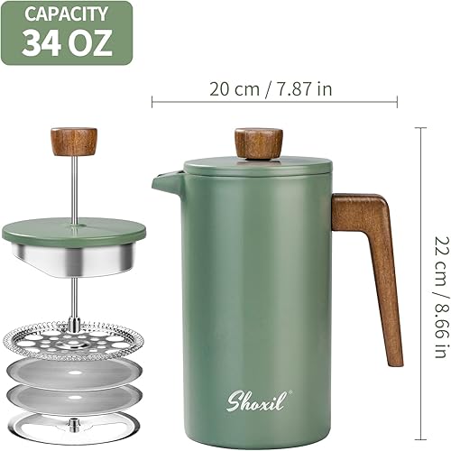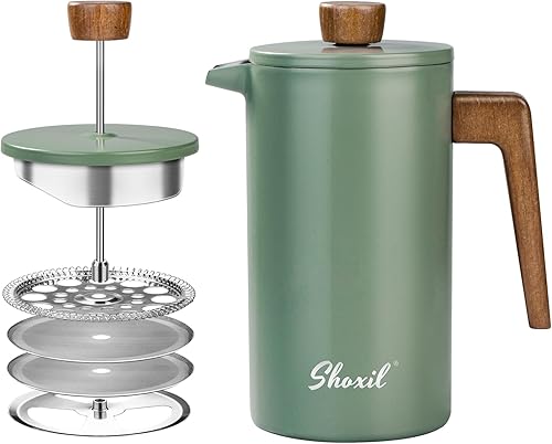 shoxil Cafetière à piston en acier inoxydable avec poignée en bois véritable, double paroi isolée avec double filtre écran, parfaite pour le camping et la cuisine