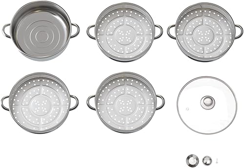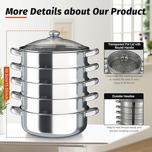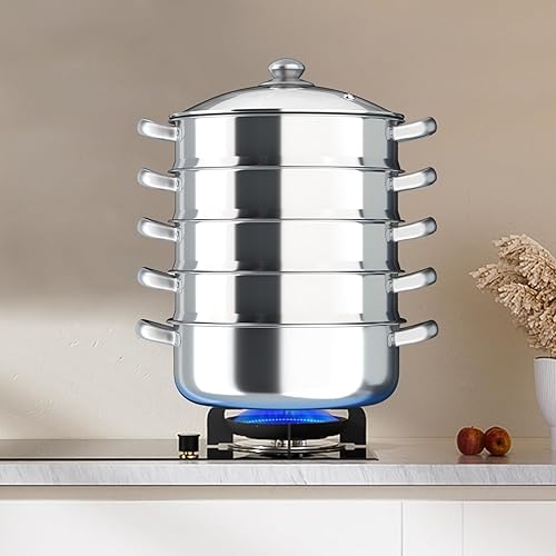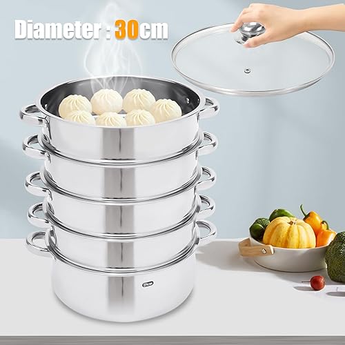 Cuiseur vapeur en acier inoxydable 5 couches, casserole de cuisson à vapeur de 30 cm avec couvercle en verre, kit de cuisine à vapeur à fond plat, poignées anti-chaleur, argent