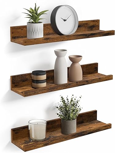 VASAGLE Étagères murales suspendues, Lot de 3, Tablettes flottantes, Longueur 38 cm, avec Bords Hauts, pour Cadres Photos, décoration, épices, pour, Cuisine, Salon, Marron Rustique LWS037X01