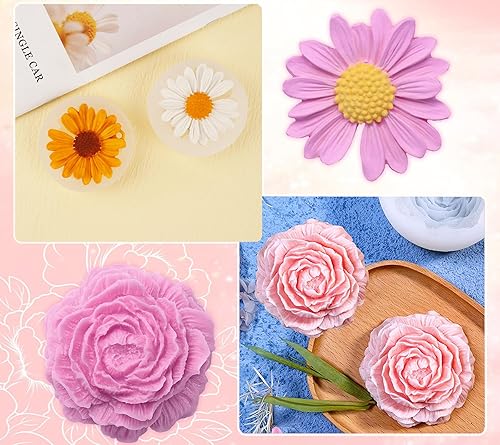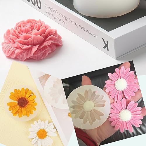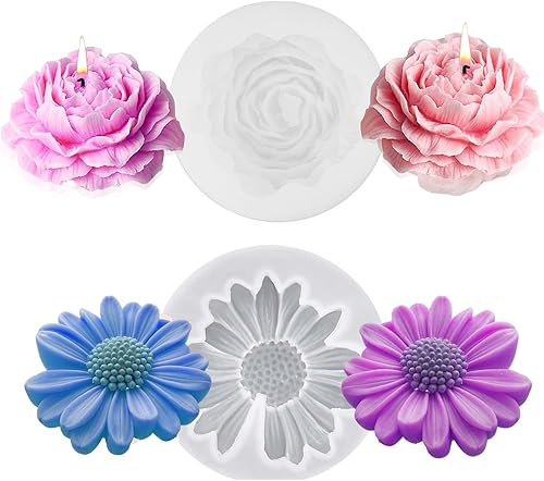 Moule Silicone Bougie Fleur 2 PCS, Moule Bougie Silicone 3D DIY, Moule en Silicone Pivoine Fleur, Moule en Silicone en Forme de Marguerite Pour Cire de Soja, Cire D'abeille, Aromathérapie, Savon