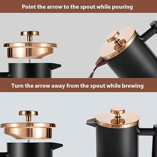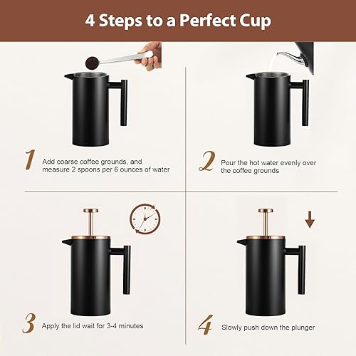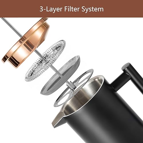 Wrobic Cafetière à piston française 600 ml - Double paroi isolée en acier inoxydable - Système de filtration à 3 niveaux - Pour la maison, le camping et le bureau - Noir