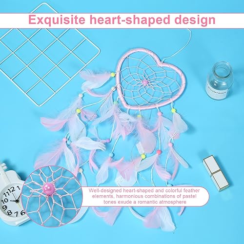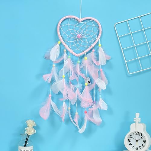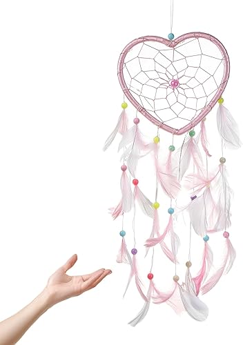 LINTRA Attrape Rêve, Capteur de Reves en Plumes Rose, 45 cm en Forme de Cœur Attrape Reve Geant, avec des Décorations en Plumes et Perles, pour Le Salon, L'entrée, la Chambre