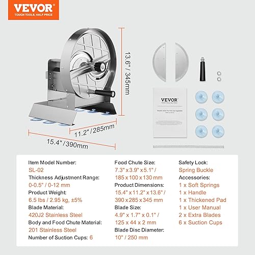 VEVOR Trancheuse Manuelle pour Légumes et Fruits, Coupe-Légumes Épaisseur Réglable 0-12 mm, Machine à Trancher les Aliments en Acier Inoxydable avec 2 Lames de Rechange, pour Pomme de Terre, Concombre