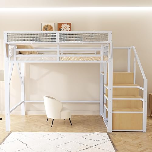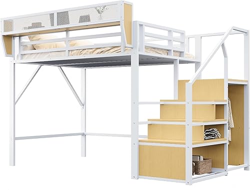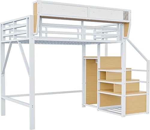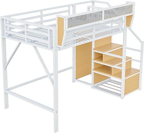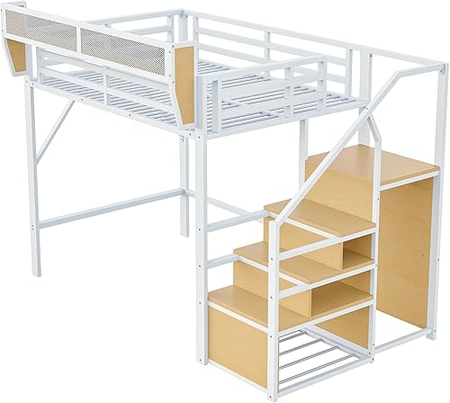 Transplant Lit mezzanine, 140 x 200 cm, en métal, blanc, multifonction, avec échelle de sécurité, compartiment de rangement flexible et sommier à lattes en métal, peu encombrant, pour adultes et