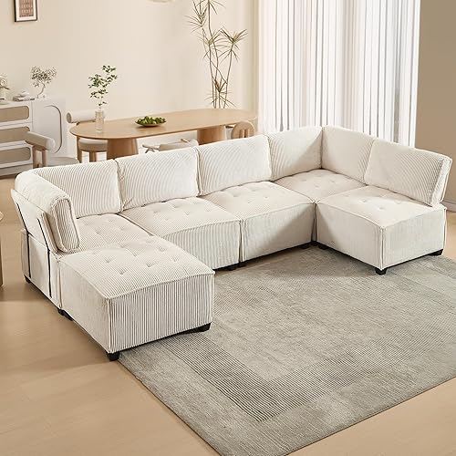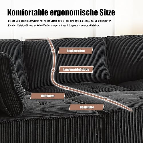 Seyakany Canapé d'angle Ergonomique modulable 6 Places de 308 cm,Moderne Canapé avec Poches de Rangement,Convertible en U ou en L,Tissu Velours côtelé,308x154x82cm,pour Salon ou Appartement,Noir