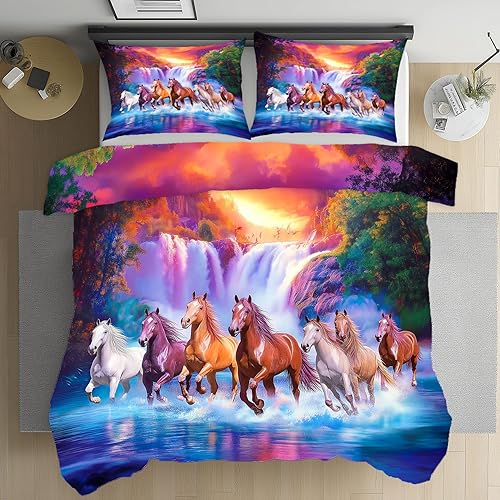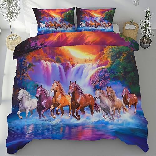 Housse de Couette 140x200 Cheval au Galop Cascade Paysage Naturel Douce et Respirante, Animaux Sauvages Prairie Parure de Lit avec Fermeture Éclair, 2 Taies d'oreiller 65x65cm