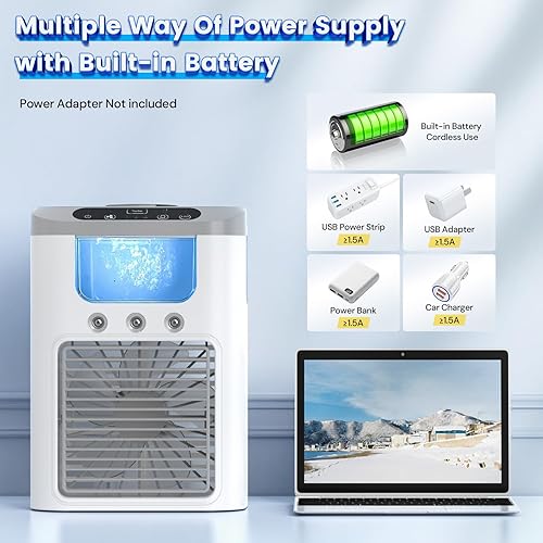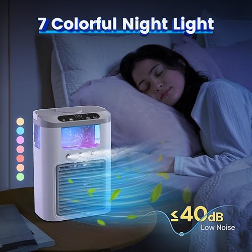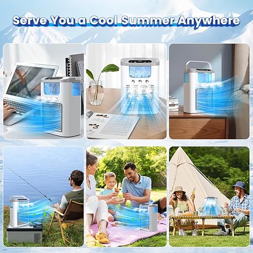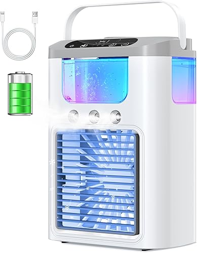 Climatiseur Mobile Portable Rafraichisseur d'air avec Batterie Rechargeable, 3 Vitesses, 3 Modes de Brume, Silencieux, 60° Oscillation, 600ML Réservoir, Lumière LED pour Camping, Bureau et Maison