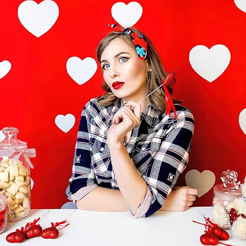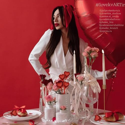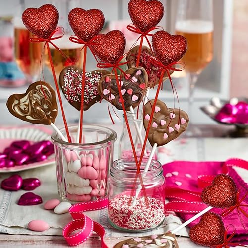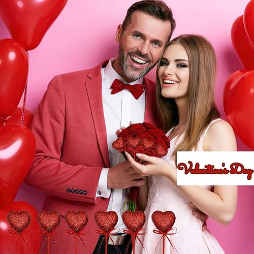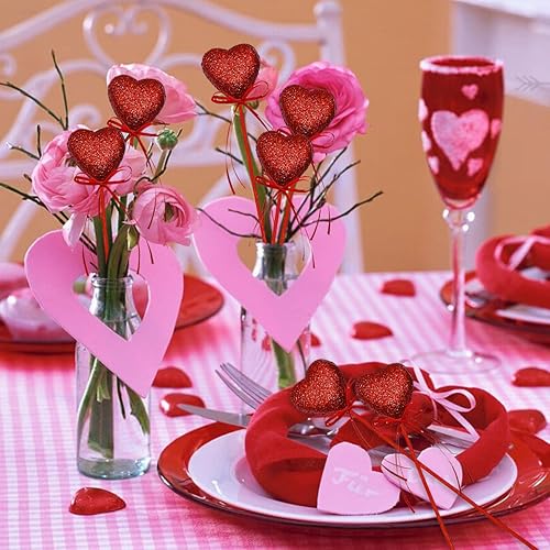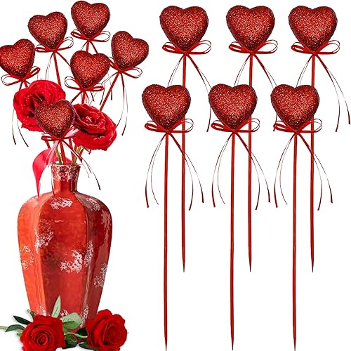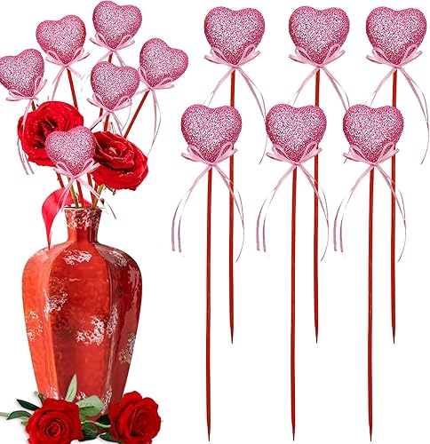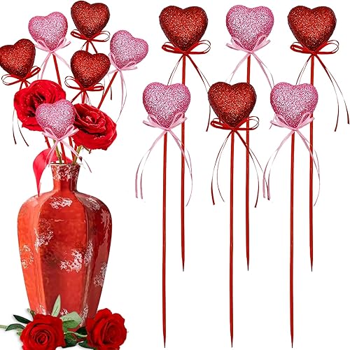 Lot de 6 pics en mousse à paillettes en forme de cœur pour Saint-Valentin, mariage, fête des mères, anniversaire, bouquet de fleurs, vase (rouge rose)