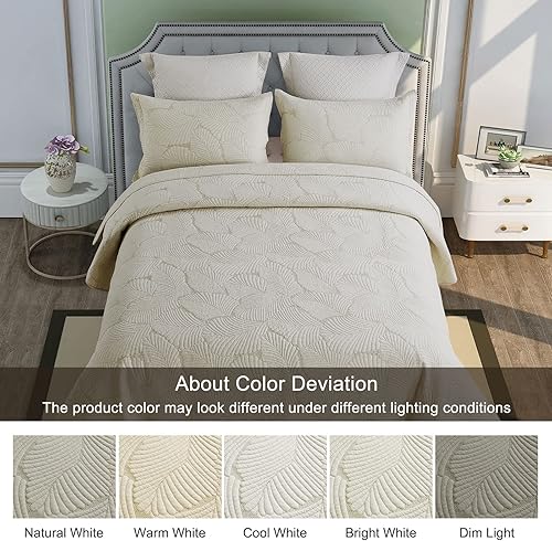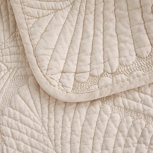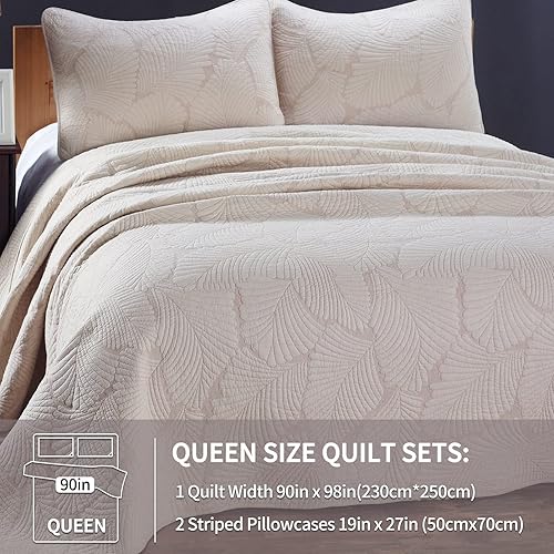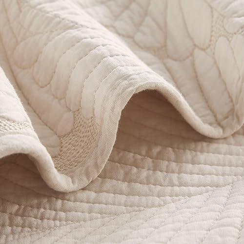 Qucover Ensemble Couvre Lit Beige 2 Personnes 220x240cm, 3 Pièces en Motif Feuille de Palmier, Boutis Coton 100% avec 2 Taies d'oreiller 50x70cm, Dessus de Lit et Jeté