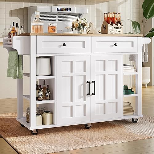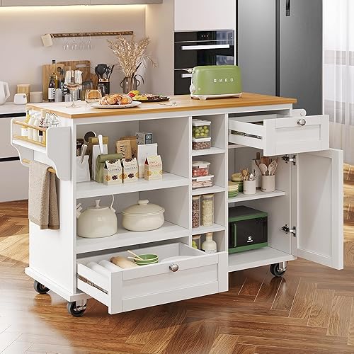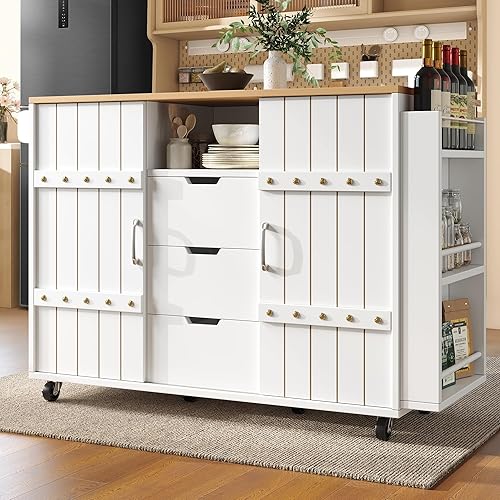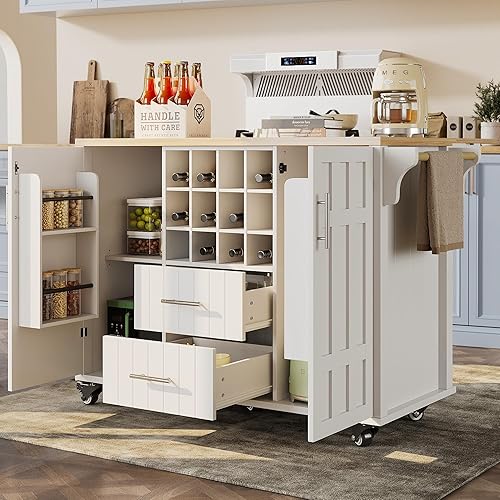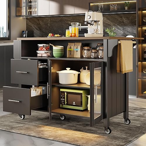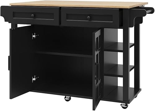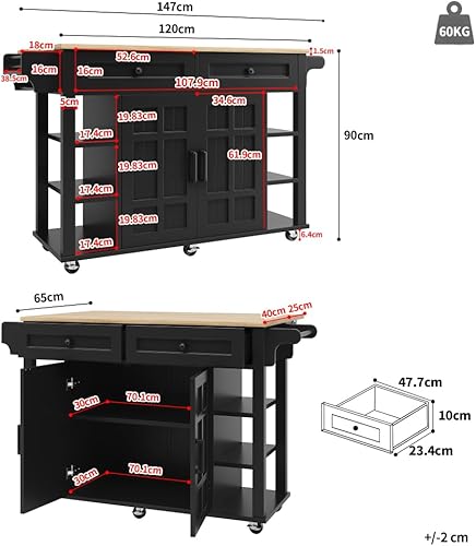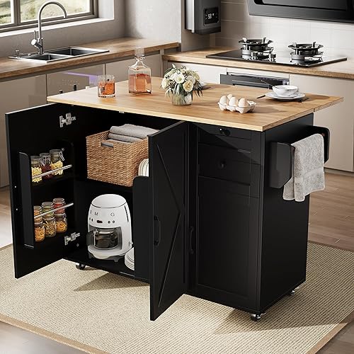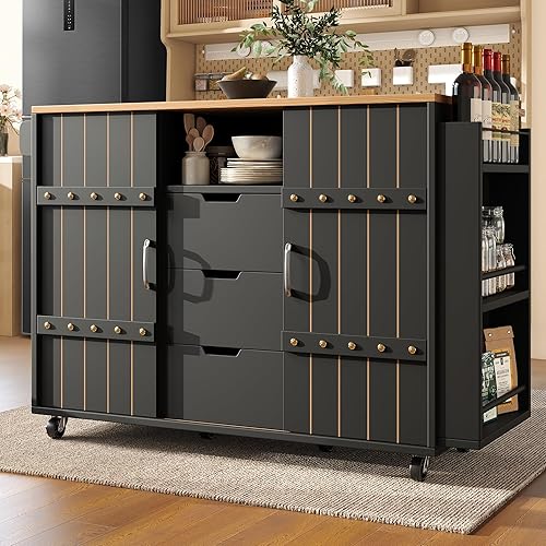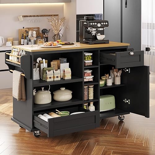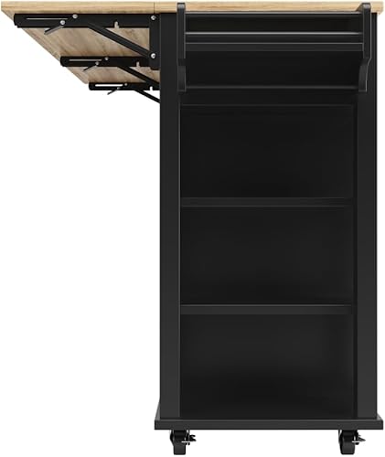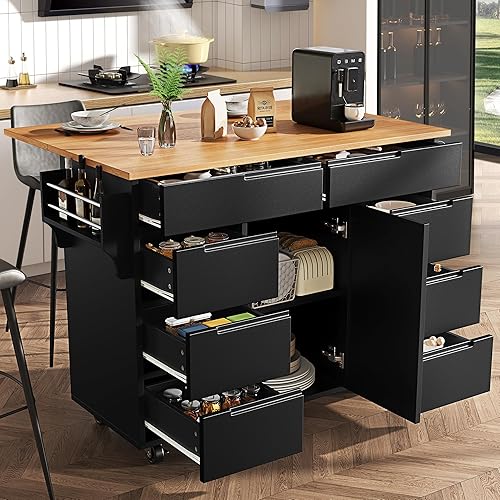 Seyakany Îlot de Cuisine avec étagère à épices et 8 tiroirs,Meuble de Cuisine,Chariot de Cuisine Extensible avec Rangement et Plan de Travail,Chariot de Salle à Manger avec Roulette,Buffet Bois,Noir
