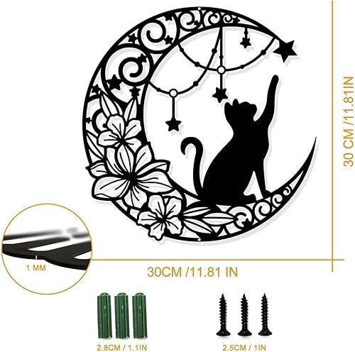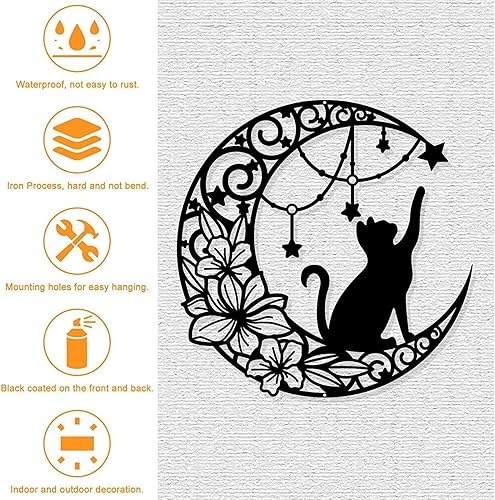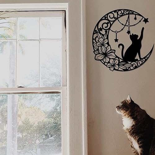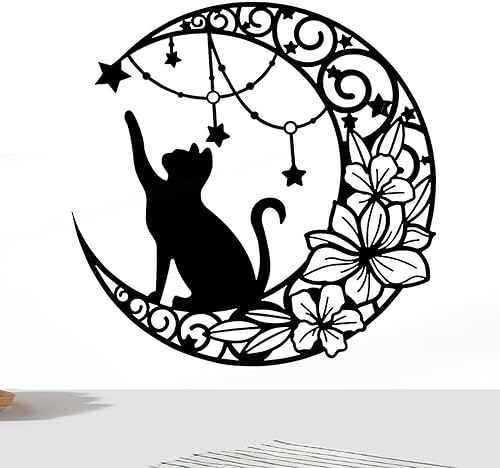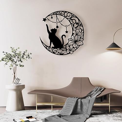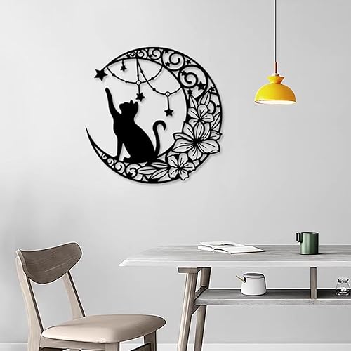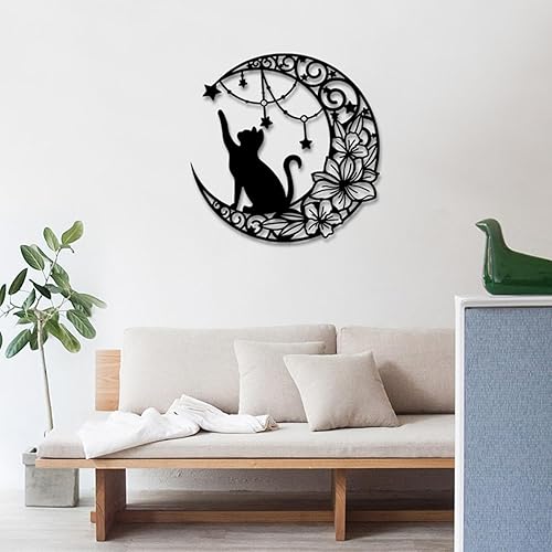 Arrovarp Décoration Murale Chat Lune En Métal, 11,8' Art Mural Noir En Métal | Métal Chat Noir Et Lune Art Mural | Chat Qui Choisit Des Étoiles Sur La Lune Décoration Murale Ronde Silhouette Art