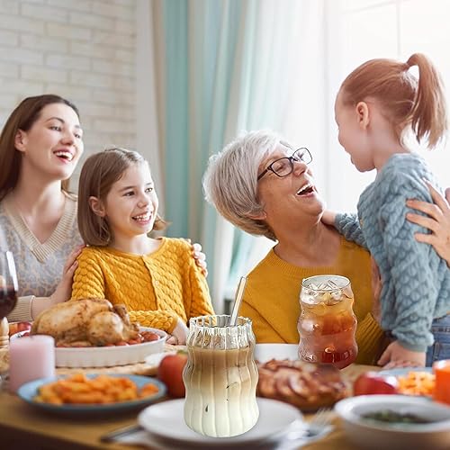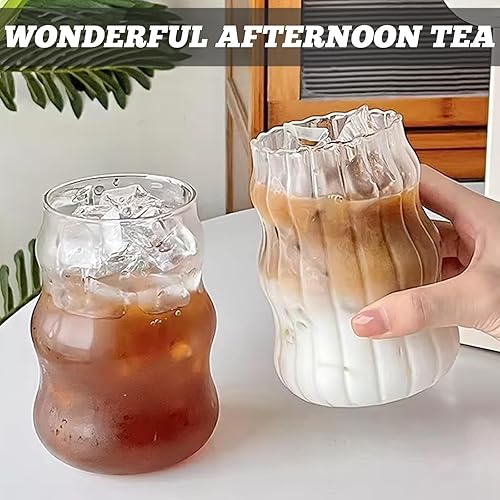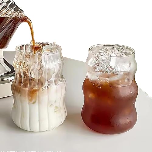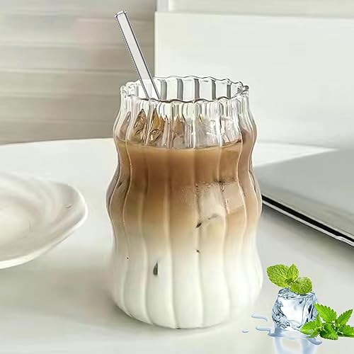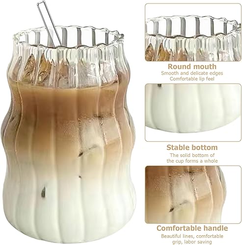 BAIFULAI Lot de 2 verres à eau nervurés de 530 ml en verre ondulé - L'un a des rayures et l'autre est lisse - Verres à café glacé avec 2 pailles et brosse à paille, verres à latte macchiato