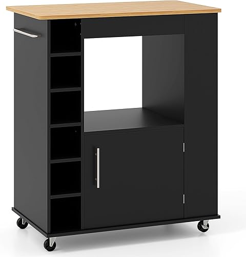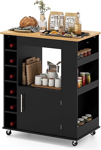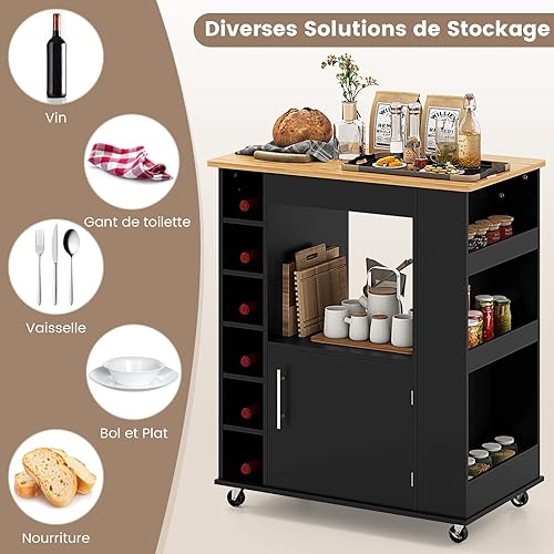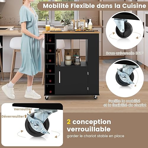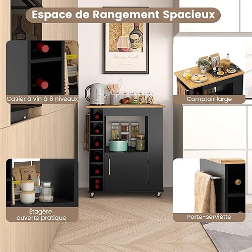 COSTWAY Desserte de Cuisine sur roulettes, Chariot Ilot de Cuisine Comptoir en Bambou, Casier à Vin pour 6 Bouteilles, Support à Épices, Roues Verrouillables, 44 x 76 x 89 cm (Noir)
