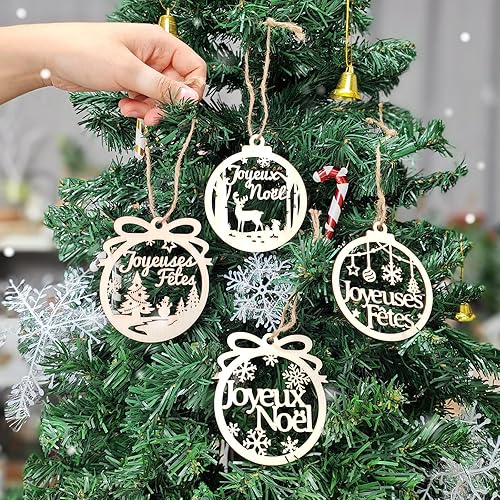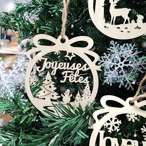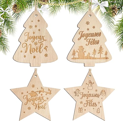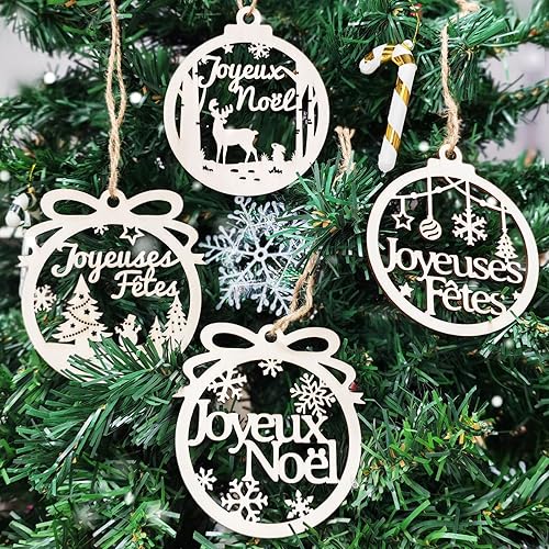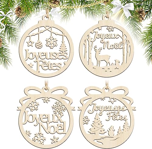 4pcs 10cm Décoration Boules de Noël en Bois Ornement Pendentifs Joyeux Noël Embellissements Tranches Joyeuses Fêtes forme Flocon de Neige Sapin Renne Scrapbooking pour Fête Noël Anniversaire Nouvel An