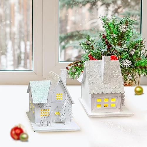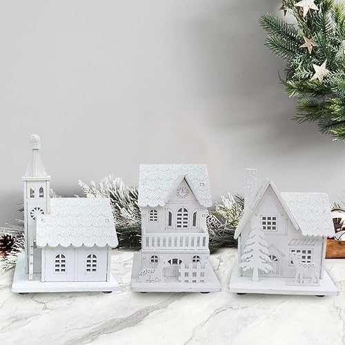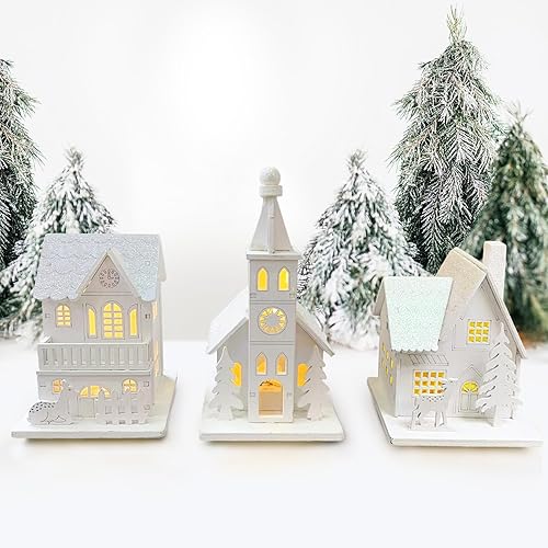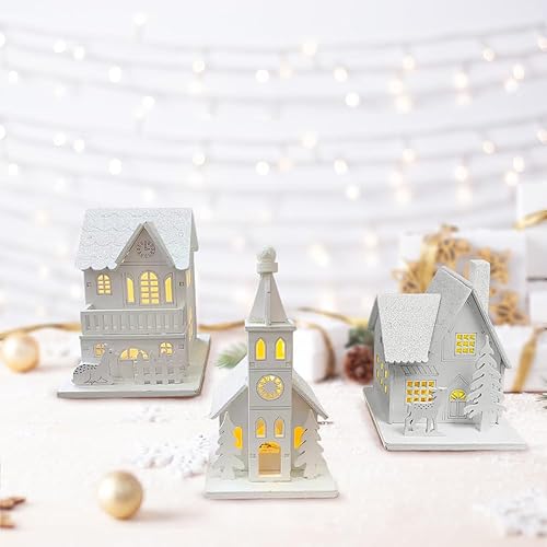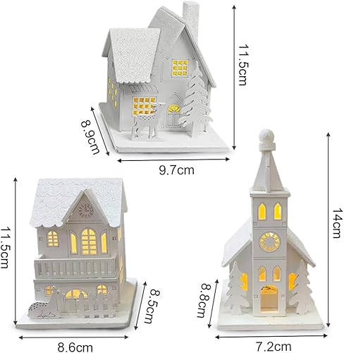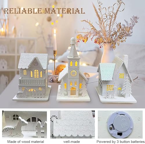 3 Pièces Village de Noel Lumineux en Bois, Maison Village de Noel Miniature LED, Maison de Neige Hiver Blanc, Deco Noel en Bois Lumineuse, Decoration de Noel Interieur à Pile, Décoration de Table Noël