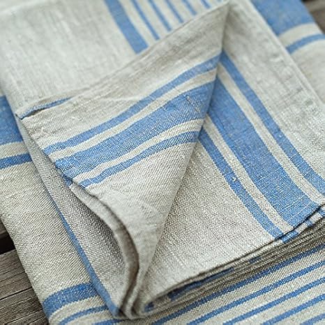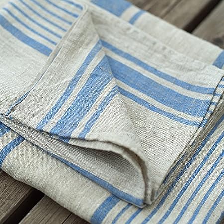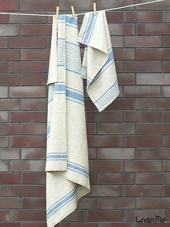 Linenme Essuie-Mains, en Lin, à Rayures, Collection Provence Hand and Guest, Set de 2, Lin Naturel/Bleu