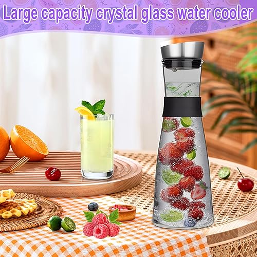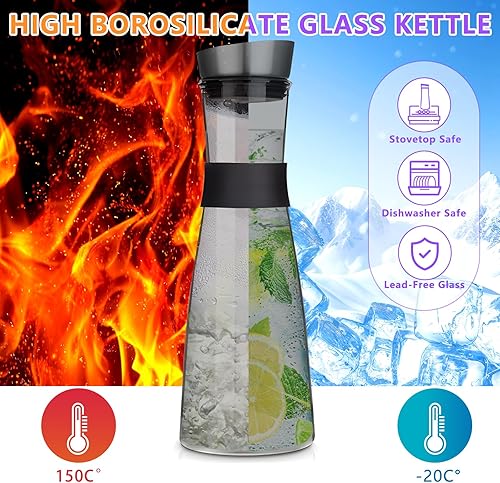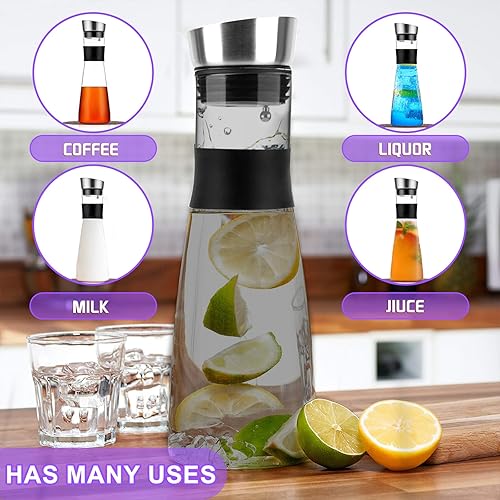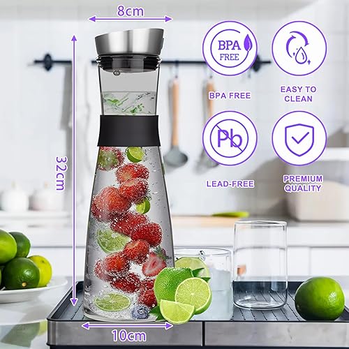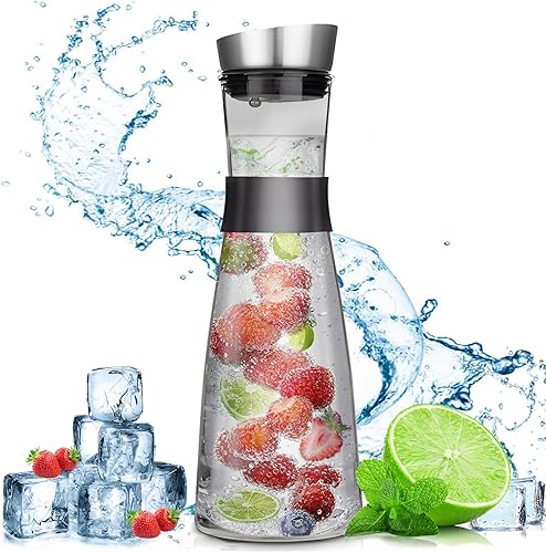 FAMKEEP Carafe en Verre,1,2 litre Pichet à Eau en Verre Couvercle en inoxydable,Pichet en Verre,pour Thé Glacé Boisson Maison Lait Café Vin de Service,Gris