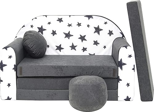 Pro Cosmo Canapé Convertible Enfant – Parfait pour Jouer et Dormir – avec Matelas Amovible, Coussin et Pouf – 98x168x59 cm – Léger et Facile à Plier – Couleur AC1 Gris (Étoiles)